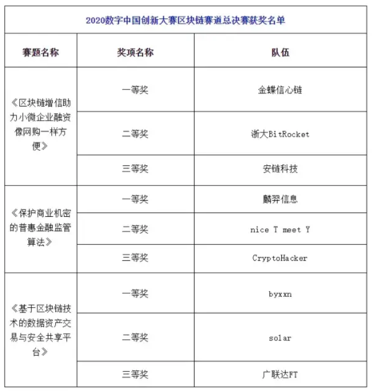 2020年10月13日,2020數(shù)字中國(guó)創(chuàng)新大賽總決賽在福州海峽國(guó)際會(huì)展中心成功舉辦。歷時(shí)5個(gè)月的賽事角逐,經(jīng)過(guò)線上線下幾輪激烈比拼。最終,來(lái)自金蝶云蒼穹區(qū)塊鏈平臺(tái)的“金蝶信心鏈”項(xiàng)目榮獲區(qū)塊鏈賽道一等獎(jiǎng),成為本屆大賽“區(qū)塊鏈增信助力小微企業(yè)融資像網(wǎng)購(gòu)一樣方便”賽最具創(chuàng)意和應(yīng)用價(jià)值的區(qū)塊鏈項(xiàng)目。